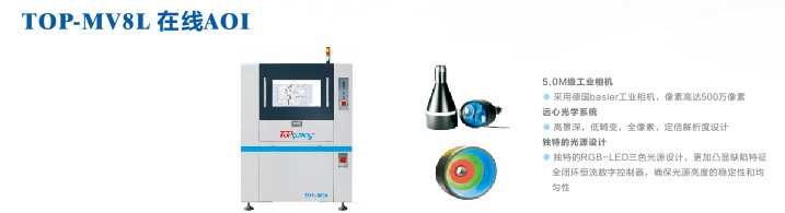 TOP-MV8L在線型AOI 采用德國Basler工業相機,像素高達500萬像素。高景深,低畸變,全像素,定倍解析設計。